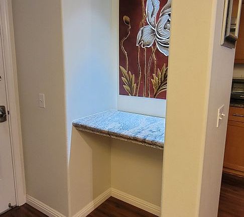 The kitchen features granite tops and stainless-steel appliances. This top floor unit has new split ac in both master bedroom as well as living area. New wood flooring throughout.
