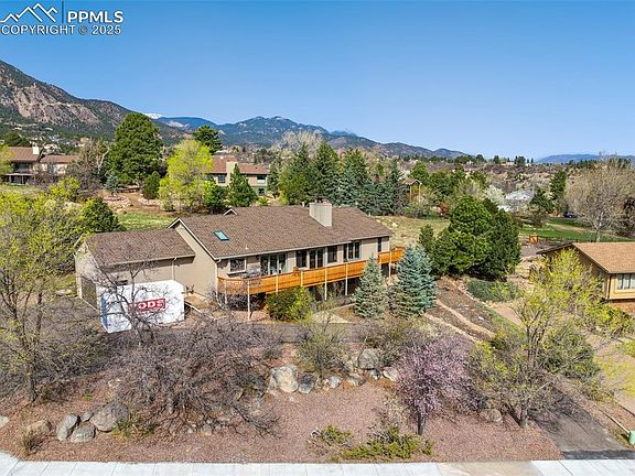 You will be delighted by the abundance of space in this ranch home situated on over 1/2 acre! Tucked into the foothills of the southwest part of Colorado Springs, this 4,652 square foot home has 4 bedrooms w/ a non-conforming 5th. Pull-through driveway and garage driveway provide ample parking and a private entrance to the home. Upon entering the home through two sets of doors (great for security and removing wet shoes), you are greeted with vaulted ceilings and expansive views of Colorado Springs. Off to your left is an inviting sunroom bathed in natural light with 4 picture windows and 2 skylights. Large living room has a wood burning fireplace and offers a walk-out to the deck that runs the length of the house. Kitchen has been updated over the years and has Corian counters, newer appliances, a garden window (great place to grow your herbs!), and a large walk-through pantry that connects to the dining room. There are 2 bedrooms on the main level, one is currently being used as an office and the other is the master which has a fireplace and a walk-out to the deck and of course, gorgeous views! Huge master closet and a large 5-piece bath. Master bath has a heated tile floor, custom tile shower, spa tub, custom wood counter, and a walk-out to a back deck. The large basement has a big family room, perfect for entertaining with its custom bar, wood burning stove, and walk-out to covered lower patio. There are 2 more bedrooms, large bathroom w/ double vanity, non-conforming bedroom/exercise room, and a hobby/storage room. Storage galore in the large garage with workbenches, shelves, and even an entrance to the basement. Home has new interior paint, low-maintenance stucco exterior, newer windows throughout, a large custom shed, Class 4 impact-resistant roof (w/ warranty). Nearby is Broadmoor Valley Park and the Country Club of Colorado with its resort and golf course, plus you have Cheyenne Mtn views and award-winning Cheyenne Mtn D-12 schools!