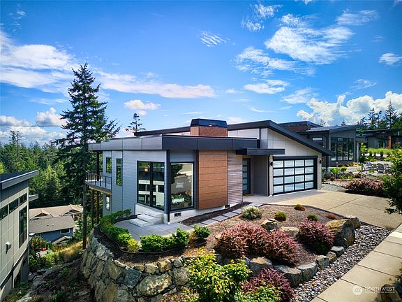 Welcome to your dreams! With this stunning modern home at the top of desirable Rock Ridge, you can have it all. Marvelous view of Guemes Channel, San Juan Islands and territorial view into the canopy of the Anacortes forest lands. Deluxe design and enduring, high-end finishes throughout. One level living on main floor, laundry room near superb primary suite. Great room with fabulous fireplace leading to kitchen/dining area. Perfect for easy, low stress living. Guest quarters on lower level has 2 bedrooms with a lovely bath. Bonus room and storage areas and a garage with a daylight door.