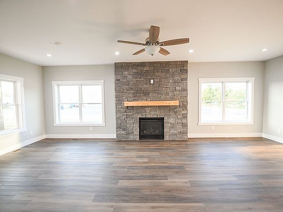 Tastefully designed 2990 SqFt New Construction home w/contrasting stone accents against neutral tones beautiful finishes & amazing golf course view from 2nd story deck Spacious modern home w/4 BR 3 1/2 BA Stunning stone fireplace in living room Open floor plan makes home perfect for large gatherings Walk-in pantry granite countertops & large kitchen island are some of kitchen's desirable features Create your own private getaway in main level master suite w/walk-in closets gorgeous walk-in tiled shower & dual sink vanity 2nd story has large family room 3 BR 2 full BA office & access to deck 30 yr dimensional shingles high efficiency HVAC system & energy efficient windows