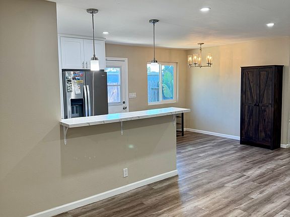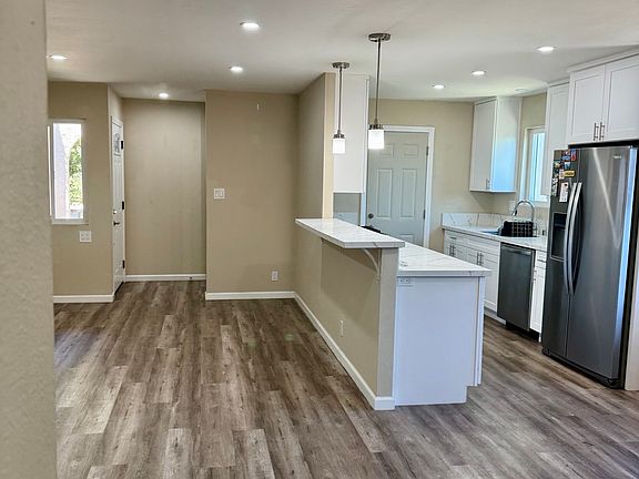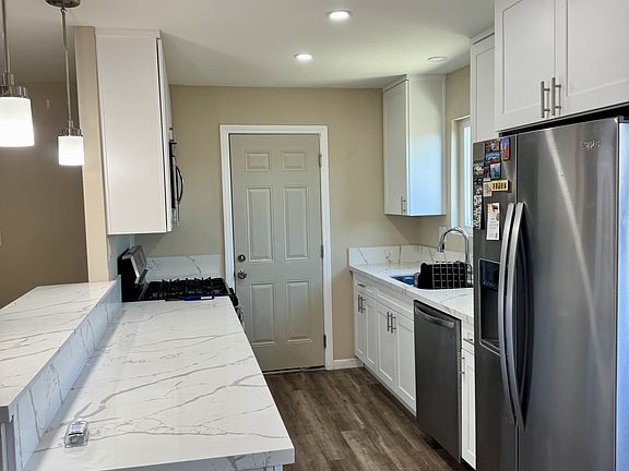 This upgraded 3-bedroom, 2-bathroom home offers a bright, open layout with modern touches throughout. The remodeled kitchen features quartz countertops and stainless-steel appliances, flowing into the living and dining areas. Bathrooms have been updated with stylish finishes, including walk-in showers. Energy-efficient windows, recessed lighting, and ceiling fans add to the home's comfort. The attached two-car garage and driveway provide plenty of parking.
