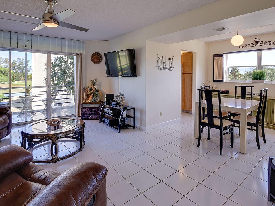 WELCOME TO THIS NATURALLY BRIGHT POPULAR CORNER CONDO WITH GOLF VIEWS,A DINING ROOM.WINDOW, TILING IN THE LIVING AREAS & GUEST BEDROOM & UPDATED KITCHEN CABINETRY. THIS PRISTINE HOME FEATURES A 23' LONG BALCONY OPENING INTO THE KITCHEN, LIVING ROOM & MASTER BEDROOM. A SPLIT BEDROOM PLAN WILL PLEASE YOUR GUESTS WITH A PRIVATE BEDROOM & ADJACENT FULL BATH.THE MASTER BEDROOM HAS 2 CLOSETS ( 1 IS A WALK-IN) AND AN ENSUITE BATHROOM WITH A WALK-IN SHOWER. THIS BUILDING IS CONVENIENTLY LOCATED ACROSS FROM THE POOL WITH A LARGE CABANA AREA. THE POINCIANA CLUBHOUSE OFFERS AN ADDITIONAL POOL , + PAY-AS-YOU-PLAY GOLF, TENNIS, MEL'S BISTRO & ENTERTAINMENT, GYM, SHOWS, CLASSES, TRIPS & THE COMMUNITY IS A SHORT TRIP TO TURNPIKE, WELLINGTON GREEN MALL, RESTAURANTS, ROSEMARY SQUARE, BEACH & PBIA