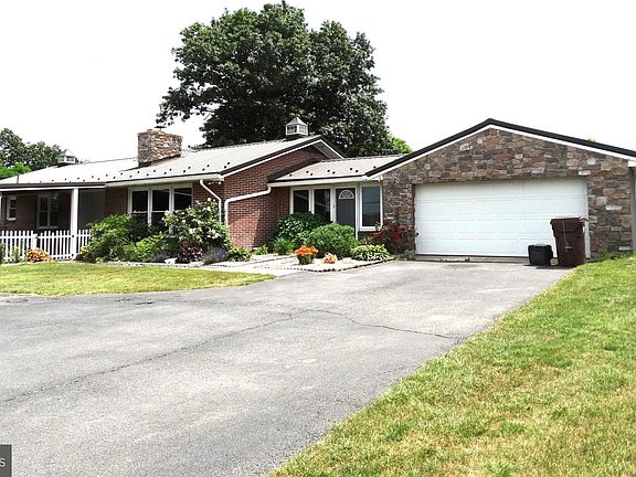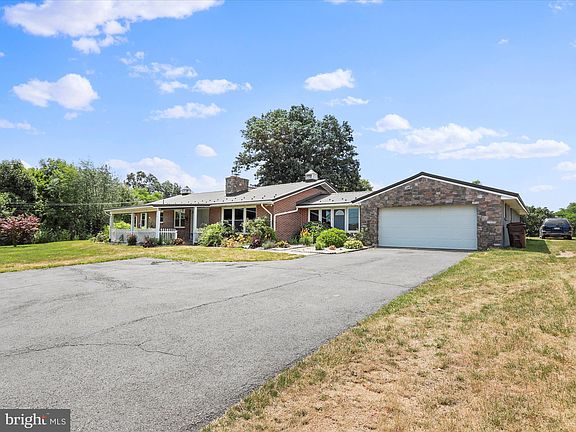 Solid Four bedroom brick rancher with full basement. Hardwood flooring , slate flooring in the foyer. Brick gas fireplace , could be converted back to wood burning. Formal dining room and country kitchen with all appliances and boasting plenty of cabinets. Main level separate laundry room. Breeze Way/Sun room has a Bomb shelter under the concrete floor. Two access doors with ladders. Enclosed rear porch. Attached 22 x 49 garage, concrete floor, openers and work benches/shelves. Metal fence dog run. Metal building 38 x 26. Landscaping around the house, pretty rose bushes, clematis, Japanese maple and many more perennials. the full basement has finished rooms, game room with wood stove, den, bonus room, utility room and two unfinished rooms.