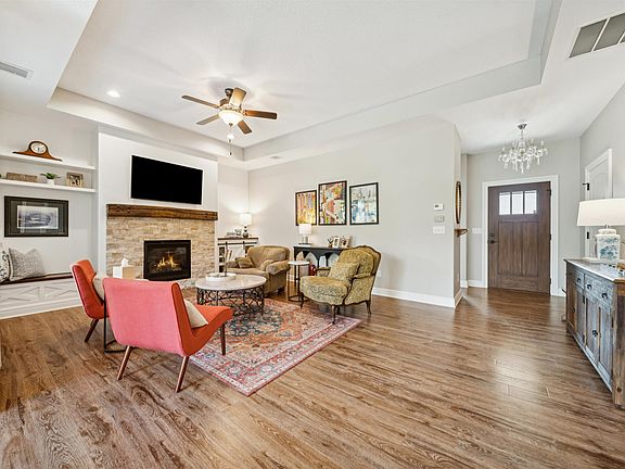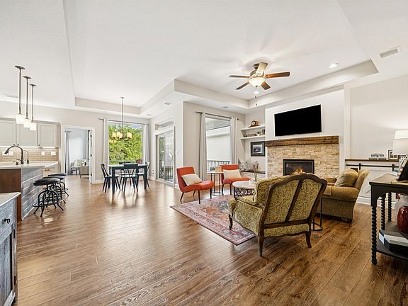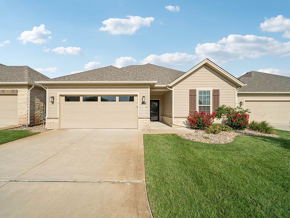 Seize the opportunity to own a stunning home in the prestigious Estancia community. This zero-entry home is designed for comfort, style and ease of living. Upon entering, you will find the guest bedroom to your immediate right. Down the hall, you will be greeted with a cozy living room with a fireplace and built in cabinet. In the kitchen, you will find granite counter tops, gas stove, filtered drink water and a large granite island. The spacious primary bedroom features wood laminate flooring, ceiling fan, large walk-in closet and a on suite with double sinks and a gorgeous walk-in shower. The screened in-porch offers cool nights in the evening shade overlooking a fenced backyard that backs up to a calming tree row. Just when you think you have everything you could think of, you walk into the oversized garage with epoxy finished concrete flooring, tons of industrial storage shelves and a tornado shelter. Estancia isn't just about the home, though. It is about the lifestyle. With maintenance free living, you can leave behind the stress of yard work, snow removal, exterior painting as the HOA takes care of those along with trash and sprinkler maintenance. The community clubhouse is a true highlight offering a heated pool, pickleball courts, and a full calendar of social activities. From card games, monthly dinners and neighborhood gatherings., there is always something happening at the clubhouse, creating a vibrant and welcoming atmosphere. Don't miss out on the exceptional opportunity.