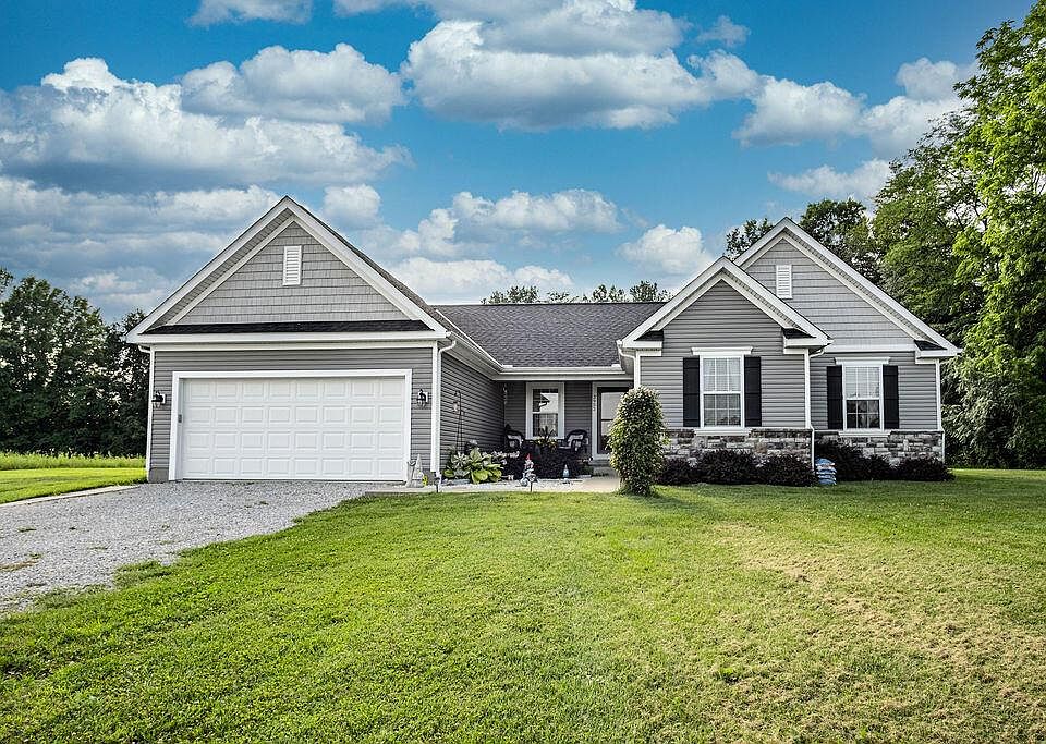 Move Right In to the open concept ranch style home. Granite Kitchen counters with Stainless appliances. Laminate floor in kitchen. Master suite with jacuzzi tub & 2-stall shower. Partial basement. Open greatroom to kitchen. Concrete patio with firepit and above ground pool is heated 30x4. Backs up to woods at rear and side. Den off of main living room. 2-car heated garage with opener. Gutter Guards. Delco Water. Highest & Best offers due 8/16/2021 at 3pm.