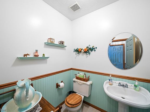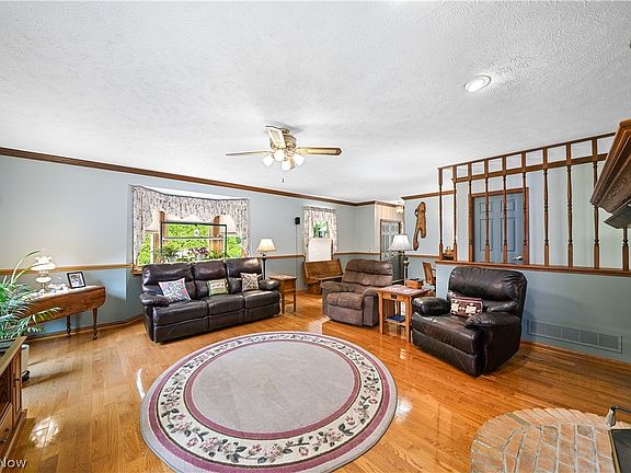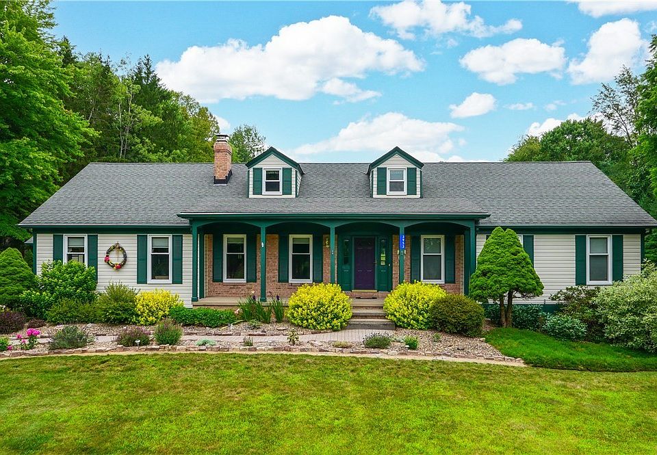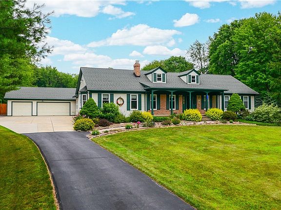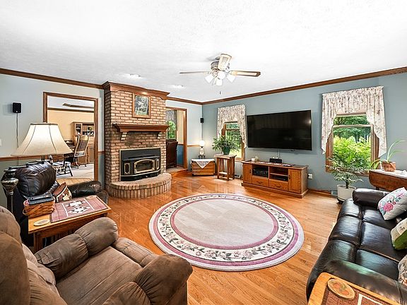 A home designed to enjoy both outside and inside. Beautiful ranch style home located on 5 impeccably maintained acres (this tree lined lot includes a large stocked pond and approx 2 acres of woods). This 4 bedroom, 3.5 bath home with hardwood floors throughout includes a home office; finished walk-out basement; finished loft with dormers and storage closets and new upgraded windows and sliding glass doors. The updated electrical/gas utilities and appliances, wood fire insert, central air, central vacuum system, and jetted tub in master bedroom create a move-in ready home. The asphalt drive leads to a 3.5 car garage and 13 x 24 storage building. A covered patio with ceiling fans adjoin the master walkout deck, and leads to the brick patio with fire pit and the 12x16 pond dock.