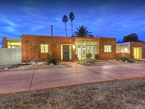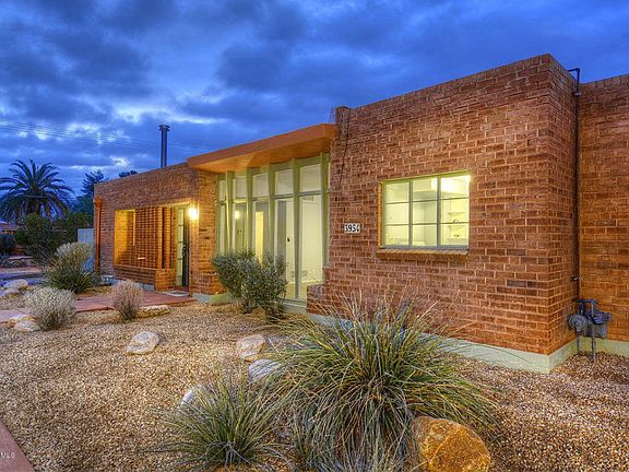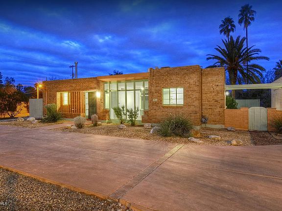 Beautiful Burnt Adobe with Modernist Architecture. Built in 1947 with floor to ceiling windows that fill this home with natural light. This home includes charming features such as: Built in niches, bookshelves. 2 bedrooms/1 bathroom in the main house. Master bedroom has separate entrance to back covered patio. Newer ceramic tile in living areas, carpeted bedrooms, 56' long covered patio, A/C, Separate Guest quarters w/private bathroom separate entrance. All on over 10,000 sq. ft. lot with North/South exposure.