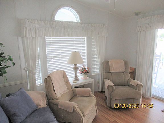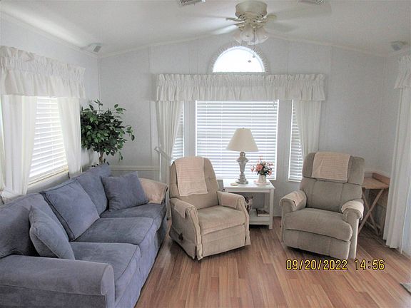 Beautiful, well maintained, 2009 Chariot Eagle Park Model home. It has two bedrooms, two full bathrooms, a huge, covered front porch and 700 square feet of central air conditioned living space. Durable sheet vinyl flooring is throughout the home. Windows are double-pane glass. It comes furnished and is move-in ready. Bring your personal items and begin living the good life in the Sunshine State! This home is on LEASED LAND with a monthly lot rent of $575.00 in an active 55+ pet-friendly community in Zephyrhills. Lot rent includes trash and lawn mowing. LIVING ROOM Enter the living room through the sliding glass doors from the huge covered front porch. The sleeper sofa, two swivel-rocker recliners, end table and electric fireplace come with the purchase. This room has lots of windows with curtains and blinds and a lighted ceiling fan. KITCHEN Has plenty of cabinets and counter space. The all-GE appliance package includes a smooth-top stove, built-in microwave, dishwasher and a side-by-side refrigerator with water and ice maker. DINING AREA Comfortable space here with table and four chairs for all your meals. There is a built-in hutch with plenty of cabinets and additional counter space. MAIN BEDROOM Has a lighted ceiling fan, built-in bureau, wall closet, built-in night stands and wall-mounted cabinets above the queen bed that stays. Room has a pocket door. MAIN BATH Full bathroom has a single sink vanity, walk-in shower with two seats, a medicine cabinet and a wall-mounted cabinet over the toilet. Pocket door. GUEST BEDROOM Big room at 11'3" x 12'8" with a lighted ceiling fan, Sleep Number queen bed, bureau with mirror, end table, and a swivel rocker recliner. There is a huge walk-in closet with a built-in desk and cabinets. Bedroom has a pocket door. GUEST BATHROOM Full bathroom with a single sink vanity and a walk-in stall shower. Pocket door. LAUNDRY The stacked GE washer and dryer are located recessed in the main bathroom. SHED The attached shed (5' x 9'4") has peg board walls and is seamlessly attached to the back of the addition. COVERED FRONT PORCH Great size at 12' x 22' plus a 6' x 13'6" section across the front of the home. Painted 5/4 decking is the floor. Could easily be screened for additional comfort. Two swivel rockers, a coffee table and sofa remain. EXTERIOR Home has vinyl siding. The AC unit and shingle roof were original in 2009. The double-wide driveway easily holds two cars. Majestic Oaks is an active 55+ pet-friendly community. The park has a beautiful clubhouse with fitness center, billiards and library. Enjoy the heated swimming pool, shuffleboard, Bocce, horseshoes, pickleball and tennis. Shopping, restaurants, a hospital and medical offices are all close by. All listing information is deemed reliable but not guaranteed and should be independently verified through personal inspection by appropriate professionals. American Mobile Home Sales of Tampa Bay, Inc. cannot guarantee or warrant the accuracy of this information, measurements or condition of this property. Measurements are approximate. The buyer assumes full responsibility for obtaining all current rates of lot rent, fees, and pass-on costs. Additionally, the buyer is responsible for obtaining all rules, regulations, pet policies, etc., associated with the community, park, or home from the community/park manager. American Mobile Home Sales of Tampa Bay, Inc. is not responsible for quoting of said fees or policies.
