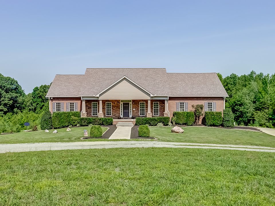 Custom Built All Brick~Beautiful hardwood floors~open floor plan~stacked stone fireplace~stainless appliances~safe room in basement~finished basement~2 different garages~creek and Pond~see media for more details