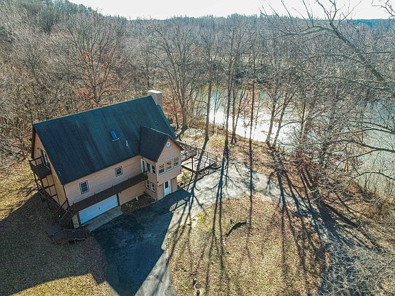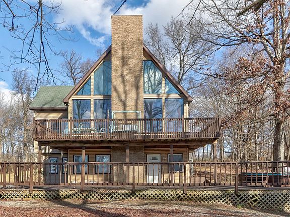 Check out this beautiful lakefront property situated on over 2 acres in Boonville, IN! This A-frame style home features 3 bedrooms, 3 bathrooms, and comes with a large yard barn and a hot tub! Up the stairs on the deck is where you enter the home. Upon entry, you are first greeted with the formal dining area and then the kitchen. This kitchen is a cook's dream, as it boasts plenty of cabinet and counter space, custom cabinetry, and stainless-steel appliances. Open to the kitchen is the living room which has a very grand feel, with over 9-foot ceilings, large, custom windows, and a floor to ceiling, brick fireplace. The living room also has spectacular views of the woods outdoors and the waterfront. Two of the bedrooms are located on the main floor and they feature carpeting, ceiling fans, and good closet space. Rounding out the main floor is the bathroom which features a linen closet and shower/tub combo. Upstairs is a loft that could be a great office space. The spacious primary bedroom is located upstairs and boasts a private balcony to enjoy your woodland views in the morning. This bedroom also features an en-suite with a garden tub and water closet. Being the only room upstairs, it really gives the feeling of a private suite! On the lower floor, there are so many possibilities of what you could use the space for. There is a private entry into this additional living space, and it features a third bedroom, a third bathroom, and your laundry hookups. Outside on the deck could be a great entertainment space for your guests. The yard barn has plenty of storage for outdoor equipment or could be a great space for a hobbyist. This property is also a fisherman's dream, as you can fish in the lake that is on the property. Don't miss out on this unique and beautiful property!