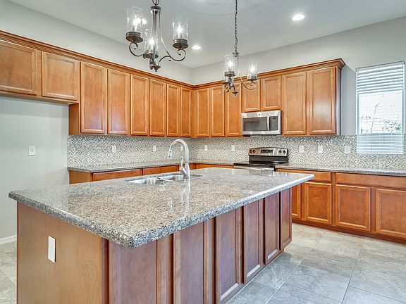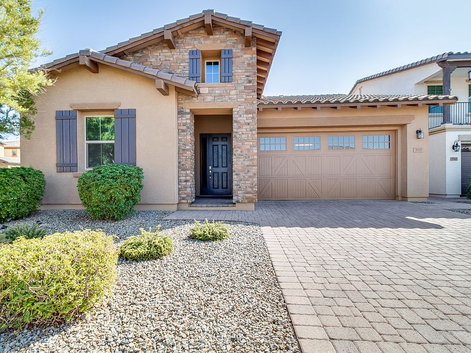 When you arrive at this charming 3 bed, 2.5 bath home, you will be blown away by the spectacular curb appeal. The stone finishes, faux shutters, and lush landscaping will catch your attention! The tall ceilings and beautiful tile floors make each living space pop with excellence. Head into the kitchen where there is an oversized island, beautiful walnut cabinetry, granite countertops, a large breakfast bar, and stunning backsplash! The living room is close by, making hosting guests a breeze! The formal dining room could also be used as a bonus living space. The master retreat has large bay windows that create a cozy reading nook, private access to the back patio, and a stunning master bathroom. The backyard has extended pavers that complement the landscaping and built-in firepit nicely. The tandem garage has built-in cabinets and a workbench, perfect for home projects and extra storage space. Schedule your showing today!
