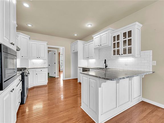Beautiful 5-bedroom home with 2 living areas and easy access to I-49. Updated kitchen features gorgeuos cabinets, granite countertops, and stainless steel appliances. Wood floors flow from the entry to the formal dining room, kitchen, and eat-in area. The primary bath has been updated with a soaking tub, tiled walk-in shower, and granite countertops with undermount sinks. Guest baths have also been remodeled with tile floors, granite, and undermount sinks. Enjoy outdoor living on the great deck and covered patio, plus a third garage bay in the back for storage or a workshop.