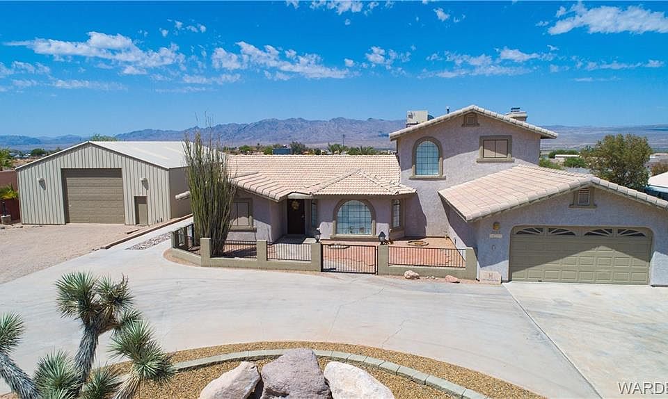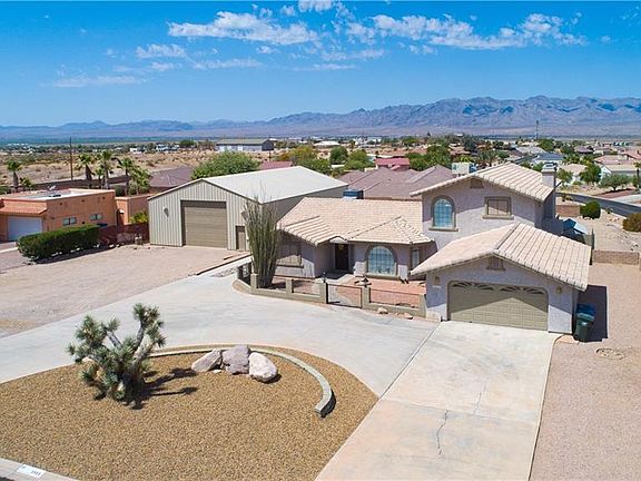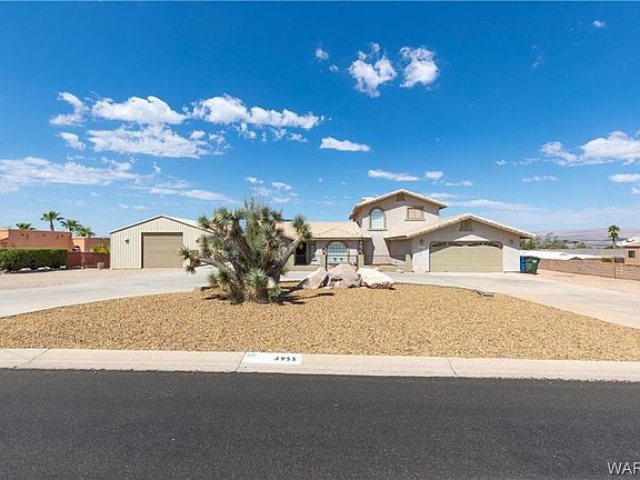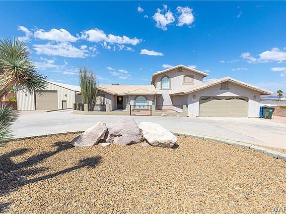 Recently remodeled interior corner lot home with unobstructed mountain views, sunrises from the front porch overlooking govt land, sunsets from back porch or second level master balcony. Block wall surrounding outdoor area with spa and gunite pool including new pump with built in seating area and table, water slide, cabana with bar, utility sink and gas hook ups for grilling, elevated covered back patio with two entrances to home. Plenty of additional lot space with RV parking and hook ups, storage shed, and second entrance to property from Stovall St to enormous pull through 40'x60' RV garage. Interior has new paint *new granite counters, sinks and cabinets in kitchen and bathroom *new toilets in downstairs bathrooms *new ceiling fans *new carpet and tile throughout *new fridge, washer and dryer that stay with the home *new soft water system *new blinds *new pump regulating water pressure to the home. Vaulted ceilings with guest bedrooms on the first floor, sunken living room in front of home, formal dining room, pot shelves, central vacuum, open kitchen with breakfast bar to extra large additional living space with refinished fireplace, large indoor laundry with new cabinets, new granite counters, and utility sink. Plantation shutters throughout. Private second level master with walk through closet and master bath with dual sinks and tiled walk in shower. Septic replaced June 2019.