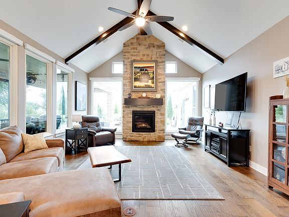 This stunning patio home offers an exquisite exterior with a partial stone façade and exceptional curb appeal. Step inside to discover a beautifully designed living space where the living areas flow seamlessly together. Words can't describe the quality & luxurious yet comfortable experience of this home! Owner have thought of absolutely everything! This 2-bedroom, 2-bath residence has a harmonious blend of charm and modern sophistication. With over 2200 square feet of beautiful, finished living area, this is one of the nicest patio homes you'll ever lay eyes on! The kitchen is a culinary enthusiast's dream, boasting an impressive fifteen-foot island with an eating bar, a convenient walk-in pantry, sleek appliances including induction stove, and gorgeous granite countertops. Unwind in the luxurious master bedroom, complete with seating area, 2 walk-in closets, and an en suite master bathroom that showcases a quartz double vanity an incredible walk-in tiled shower and water closet. The second bedroom provides ample space for guests or family members along with their own bath. Large windows frame panoramic views of the lush surroundings, while the open concept living spaces flow effortlessly for entertaining or quiet reflection. Head outside to your own slice of paradise. Owner is a garden whisperer. Tons of love put into the yard, patio, and pond area. So much custom landscape and 2 picturesque ponds. Whether you're sipping morning coffee on the covered patio, hosting sunset gatherings by the water’s edge, or simply soaking in the serenity from your backyard patio, this home offers a rare connection to the outdoors. For added security, the garage includes a Wizard of OZ concrete safe room. Living in this community means enjoying carefree days with HOA dues covering landscape and sprinkler system maintenance, trash service, snow removal, and exterior building upkeep (excluding roof, windows, and doors). Residents also have exclusive access to a unique clubhouse that includes pickleball courts, an outdoor heated saltwater pool, and a variety of social and fitness amenities. Inside the clubhouse, you'll find a great room with kitchen and buffet space, a card/game room, restrooms, and an exercise room equipped with resistance and cardio equipment. Combine upscale amenities and beautiful outdoor living and you will see why our courtyard Community at Estancia is so popular!