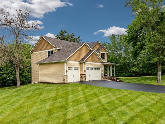 This stunning 5 bedroom, 4 bath, two story executive home is located on a .5 acre lot with a neighboring .9 acre lot also for sale. This home is nestled among trees for privacy and is perfect for entertaining both inside and out! Outside, relax on the wrap around front porch, or the private backyard deck or patio. Step inside to the main level featuring an open floor plan with oversized windows. Kitchen includes a granite center island with breakfast bar, stainless steel appliances and hardwood floors. Upper level includes 4 bedrooms, laundry room with a sink for convenience, as well as a built in desk work area. Master bath includes separate tub and shower and dual sinks. Living rooms on the main and lower level feature gas fireplaces surrounded by beautiful stone. Lower level includes a wet bar, a 5th bedroom, 3/4 bath and exercise/flex room. Step onto the beautiful stamped patio to enjoy the wooded backyard and just steps away from the Dakota Rail Regional Trail for biking.