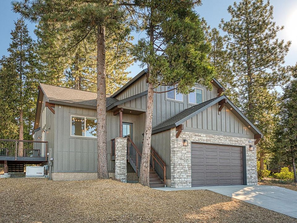 Welcome to the beautiful and tranquil gated community of Sunrock in picturesque Shaver Lake! This stunning brand-new, modern-rustic home, completed in September 2024, offers 2,375 sq.ft. of living space. With 4 spacious bedrooms and 3.5 bathrooms, including a primary suite on the main floor and a secondary primary upstairs, this home is designed for both comfort and style. Enjoy breathtaking SUNSET VIEWS from the oversized deck or cozy up by the floor-to-ceiling rock fireplace equipped with an efficient Fireplace Xtrordinair gas insert. The open floorplan features vaulted ceilings, a large loft, custom tile showers, beautiful custom cabinetry and modern lighting. Quartz countertops, a large island, beverage bar and stainless-steel appliances complete the kitchen. Additional highlights include central heating and air-conditioning, cement-board siding, a large 2-car garage, easy year-round access and an on-demand whole-house Generac 18K generator, ensuring you are never without power. This well-maintained subdivision features wide roads, immaculate landscape, and a very reasonable HOA fee of $137 per month, covering snow removal, trash service, gate and road maintenance. Located just 5 minutes from the lake and 25 minutes from China Peak Ski Resort, this home offers the perfect blend of comfort, luxury and convenience!