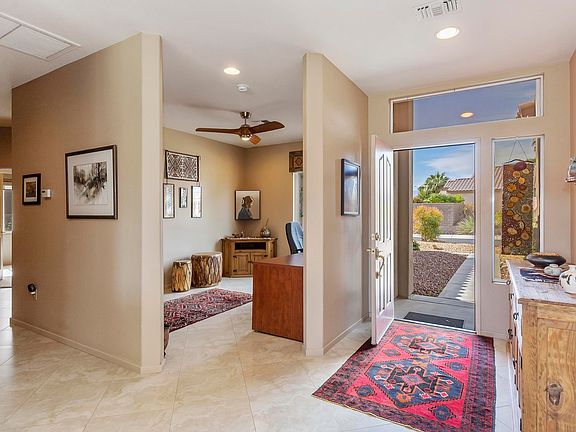 Fabulous St. Croix on Golf Course! Offered FURNISHED per inventory. (some exclusions) Elevated over the 6th fairway of the Santa Rosa course. Spectacular views of the Chocolate Mountains. This home is bright and cheerful and boasts elegant neutral diagonal tile floors throughout and carpet in bedrooms. Sunny breakfast nook and kitchen, that opens up to main living area, with prep island, eating bar and plenty of counter space. The extensive great room also offers views of the relaxing patio and mountains. The master suite, is an attractive feature of this floor plan offering spacious seating area and private bathroom with walk-in closet with organizing shelves. Guest bedroom & bathroom on opposite side for comfort and privacy. Also features a den/office that opens up to the great room. Indoor laundry room w/ cabinets and 2 car garage with cabinet storage. Updated features to include: a couple of newer windows and sliding door, exterior paint and weep screed, garage door and so much more. Come see this beauty and live the desert lifestyle!
