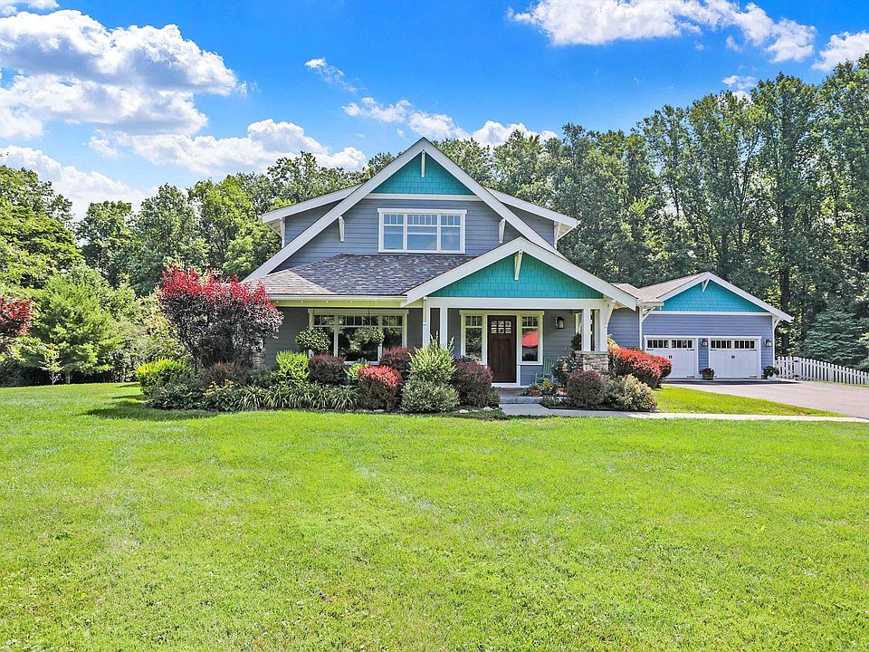 Stunning craftsman style home on 1.87 acres located on Bloomington's northeast side! On the main level you will find the living room with wood burning fireplace, formal dining room, sun room, spacious eat in kitchen, the primary suite and laundry/mudroom area. The kitchen has custom cabinets, quartz counter tops, double ovens and a dining area large enough for a 10 person table. Upstairs you will find 3 bedrooms, all ensuite as well as den space with built-in desk. In the basement, there is the 5th bedroom, a full bath, family room and tons of storage. The home has many exterior features including a large barn with half bath, attached two car garage, fenced yard, invisible pet fence spanning the entire property and basketball hoop. Many updates have been done in the last 5 years including: roof, tankless hot water heater, new flooring upstairs and raised garden beds.