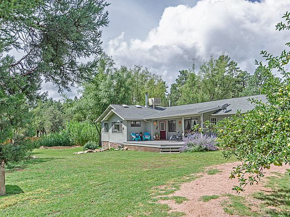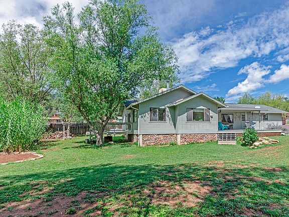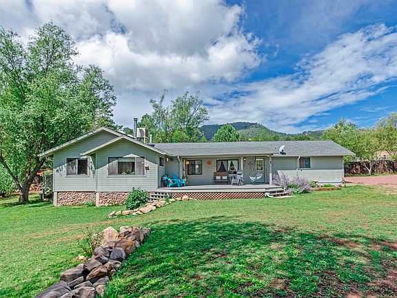 Lovely setting on .66 acre. Cozy single level home features a sunny living room with engineered wood floor, vaulted ceiling with skylight. Compact kitchen & dining area anchored by a wood stove. Quaint sunroom with sliding glass doors out to deck & side yard. Two flex rooms (office/den/play room/quilting room). Main bedroom with ensuite bath. Laundry room with storage shelves. Partially covered maintenance-free deck across front of house overlooking grassy front yard. Huge RV carport, office with 3/4 bath & kitchenette, greenhouse, 2 chicken coops, workshop, storage sheds, garden shed, water storage tank. Property is completely fenced & shaded by mature trees & several apple trees. 2-car garage. Sold in AS-IS condition with non-working solar-operated well & solar system. No HOA.