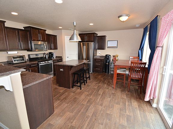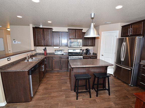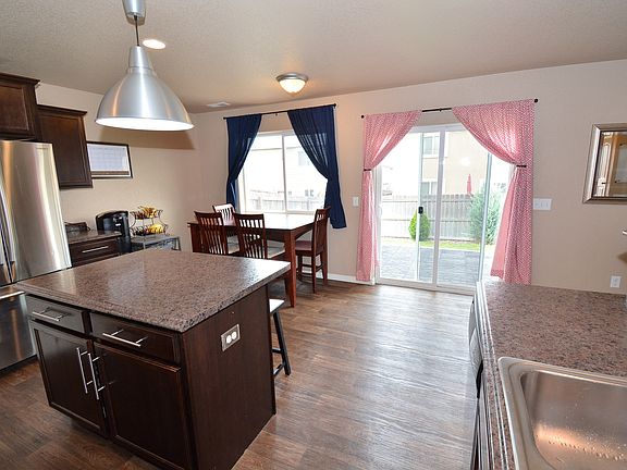 Welcome home to this cozy & open 2-story home located in Mule Deer Crossing. Walking distance to Sand Creek High School & Remington Park. Covered entry opens to the great room perfect for relaxing or entertaining, with easy access to the kitchen & a large picture window letting the natural light pour in. The eat-in kitchen boasts upgraded cabinets w/crown molding & modern hardware, can lighting, woodplank vinyl floor, center island, breakfast bar, &stainless steel gas range/oven. From here you can walk-out to the concrete