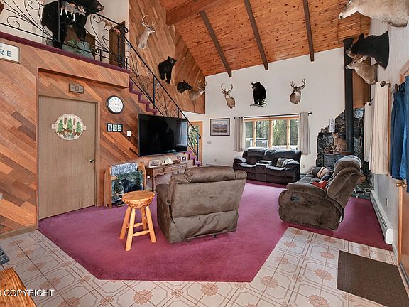 Beautiful 3000SF+ Alaskan home on a very private 8.82 Acre setting! HUGE 936 sq. ft Detached Garage! Pine T & G Vaulted Ceilings with exposed beams, updated Hickory kitchen cabinets, wrap around decks, upper deck. Amazing Alaskan art stair banister, diamond willow railing, shed, extra office & storage. Natural Gas Boiler, Peaceful and secluded setting, close to the Moose and Kenai Rivers no CCRs.