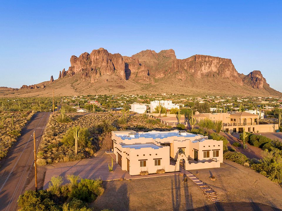 Timeless, classic and comfortable describes this remarkable home with 3 bedrooms, 2.5 bathrooms and den. From the moment you arrive, you will captivated by the rugged landscape of the Superstition Mountains that surround you. The open floor plan effortlessly connects the living, dining and kitchen areas, creating a sense of spaciousness and light. The living room is framed with large, seamless windows offering amazing views that evolve with the changing colors of the sky and mountain throughout the day. The kitchen is a haven for culinary enthusiasts, providing ample room for preparing and entertaining large groups or intimate gatherings. The primary suite is a sanctuary for relaxation featuring large shower, jetted tub, dual vanities and two walk-in closets. The two additional