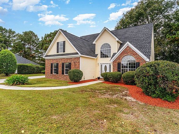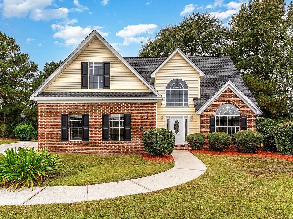 This classic home is nestled on a unique and quiet cul de sac in the established community just a short drive from the beach! New roof and HVAC system! First floor Primary bedroom! From the moment you enter the brand new front door you will love the two-story foyer with tons of natural light, beautiful open staircase and spacious formal Dining Room with vaulted ceiling. The kitchen features newer stainless steel appliances, tile back splash and solid surface counters and is connected to a breakfast nook with views of the sprawling back yard with loads of mature trees and landscaping. The large family room also boasts vaulted ceilings, ceiling fan and new French doors leading to the shaded patio. The primary bedroom has a huge walk-in closet and an en-suite bath with double sinks, soaker tub and separate shower. Upstairs there is an open loft area overlooking the family room, two very spacious bedrooms and a nicely updated full bath. The carpet is all new and is Stainmaster with extra thick padding and a transferrable warranty. The 2 car garage features built-in storage and is side loading. You can easily fit six cars in the driveway! Glenmere is centrally located - giving you great access to all the attractions of the Grand Strand. The HOA dues are very reasonable and cover the community pool, Internet and Cable TV. Sellers have replaced the roof, entire HVAC system, front and back doors, kitchen appliances, flooring and so much more! Washer/Dryer and all appliances convey!