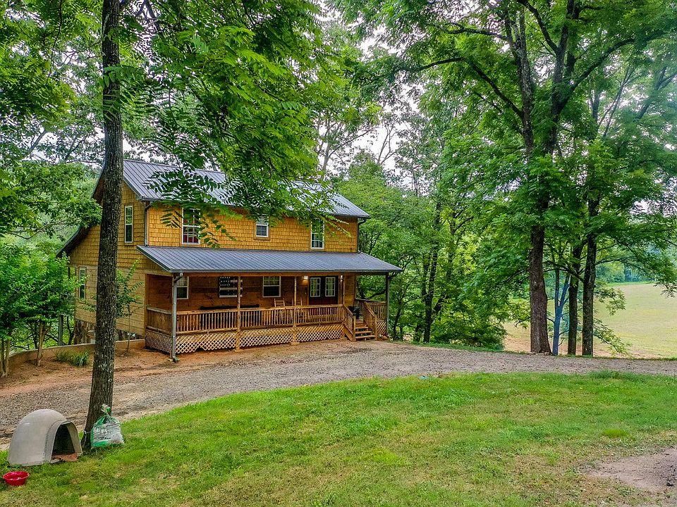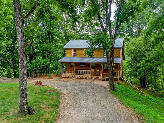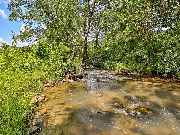 Talk about wanting to escape the hustle and bustle? This is it! Sitting privately on almost 6.5 Acres (mostly pasture land) and fronting bubbly beautiful Stover Creek, this delightful cabin is a dream come true! Enjoy spacious rooms with large primary bedroom suite on main floor, 2 large bedrooms, a small loft upstairs and a full unfinished walk out terrace level for expansion. Open family room. Lower level mostly unfinished set up for bedroom, family room and bath with lots of daylight and creek views. Great outdoor decks. Home recently stained. No restrictions. And a special bonus...there's an RV pad with electric connection and septic already in place. Original owner, never been in a rental program. Excellent condition. Circular driveway. All paved roads to town.