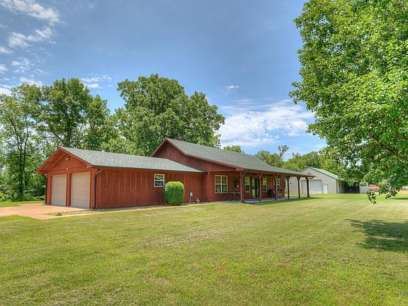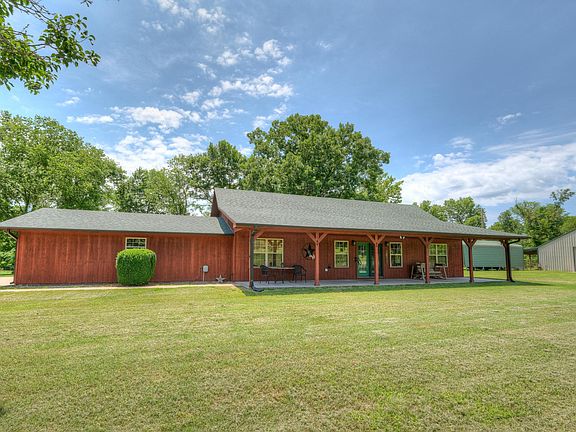 This pristine ranch style home sits creek side on 14 acres. It has an open floor plan including the living room, kitchen and dining area with a vaulted ceiling. The living room includes a ventless gas log fireplace! The large primary bedroom features a walk-in closet, and the attached bath has a sit down shower, jacuzzi tub, and double vanity. There are custom oak cabinets throughout the kitchen and bathrooms. Spacious kitchen with a large sink overlooking the creek. Ceramic tile is laid throughout the main living areas, bathrooms and laundry room with carpet in the bedrooms. Guest room 1 has a double closet and double windows. The land is incredible, with Indian Creek frontage, fenced pasture, and a 30x40 shop with a mirroring lean to on each side. RV hookup, detached carport, and anattached garage will give you ample parking and space for storage. This home sits just outside of city limits but does have city water! Enjoy spending your days relaxing on the covered porch listening to the creek flow by. Call today for a tour of this magnificent property!