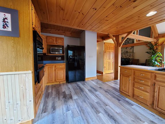 This lovely Post & Beam home, built in 1993 by North Woods Joinery, Cambridge, VT, using Structured Insulated Panels (SIP), welcomes you with comfort & warmth. From the cathedral ceilings, natural woodwork, soaring fieldstone fireplace with VT Castings woodstove insert, to the double atrium doors to the deck, this home is nicely sited on 2.46 surveyed acres with privacy at the end of the road. Step into a lg oak cabineted kitchen with double pantry, newer vinyl plank flooring, breakfast bar seating for 4-6 with gas cooktop & cutting board. Open to the dining room and the fireplace, step into the living room with atrium door to the full length front deck to enjoy a south easterly view. There's a full bath on the main floor plus a lg bedrm with double closets .The primary bedrm has a 3/4 shower stall, jetted tub, tile floor & storage in the knee wall space. The basement is mostly finished to include a mudrm entry from the garage w/a woodstove, a laundry rm with 1/2 bath, space for your office & family rm. Meadow Wood Association fee is $600/yr and covers road maintenance. The septic tank is located on the front lawn & was pumped 6/22; the leach field is off site yet located nearby. There's space for your garden in the upper back yard, there's a pretty ledge outcropping w/birch trees & a good mix of softwood, hardwood & maple trees. There are 11 acres of common land & includes a pond.St Johnsbury Academy/high school choice, K-8 Elementary School.