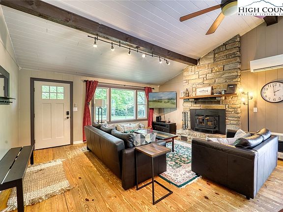 Turn-key successful short-term rental located just five miles from the historic town of Blowing Rock. This cozy, fully furnished two-bedroom, one-bath home sits on a one-acre flat lot surrounded by lush landscaping. Enjoy a large deck ideal for hosting gatherings and a fire pit to relax by while soaking up the great outdoors. Step inside to an open layout that glows with natural light, featuring a spacious living room with high ceilings, a mini-split for AC, and a wood-burning fireplace perfect for winter nights. The open air kitchen boasts stainless steel appliances, gas stove, ample counter space, and cabinets for storage, and a breakfast bar. Adjacent to the kitchen is a dining area with sliding glass doors that open to a deck overlooking the yard. The bedrooms include a primary with a king-size bed and a guest bedroom with a queen-size bed. Both bedrooms have generous closet space and energy-efficient window air conditioning. The bathroom highlights a tub/shower combo with modern furnishings. Laundry area is configured with a stackable unit and storage shelving but can also accommodate large capacity, side by side washer/dryer. The partially finished basement makes this home the perfect getaway for outdoor enthusiasts. French doors from the outside allow easy entry for bikes, motorcycles, snowmobiles or four-wheelers. Plenty of space for your ski gear or other off season items. Accessible from inside the home, it is currently configured as a game room, equipped with a flat-screen TV, ping pong table, and couch. Additionally, this property offers room to expand- there’s potential to finish the basement and add an extra 1,050 square feet to the home. The large, flat lot could easily accommodate an RV or secondary dwelling unit. The home features a new roof and electrical panel replaced in 2023, new septic system installed in 2010, Gross rents for 2023 totaled $40,137, $40,028.61 in 2022, and $34,962 in 2021 with owners blocking out dates to stay there.