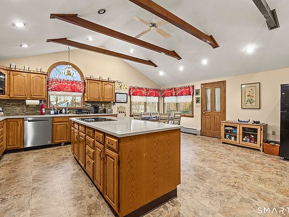 - Features: Cathedral Ceiling(s), Beamed Ceilings, Ceiling Fan(s), Kitchen Island, Vinyl Floor
