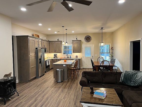 Nice country home sitting on 8.6 acres with a split floor plan, ten feet ceilings in living/dining area, and large porches to enjoy the wildlife and sunsets. Off the back of the home is a two-car covered parking area and large storage area with a garage and walk in door. This home does set off of the road with a long driveway in the middle of the wooded lot. Buyer would have many options as far as keeping trees, farming, having farm animals, or a large garden.