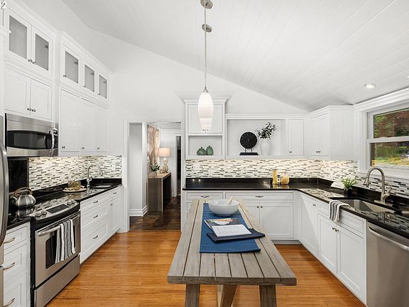 - RoomKitchenFeatures: Granite Counters, Microwave, Island, High Ceilings, Updated/Remodeled, Engineered Hardwood