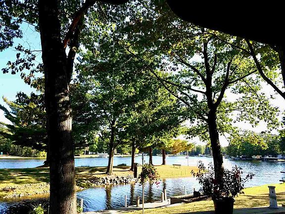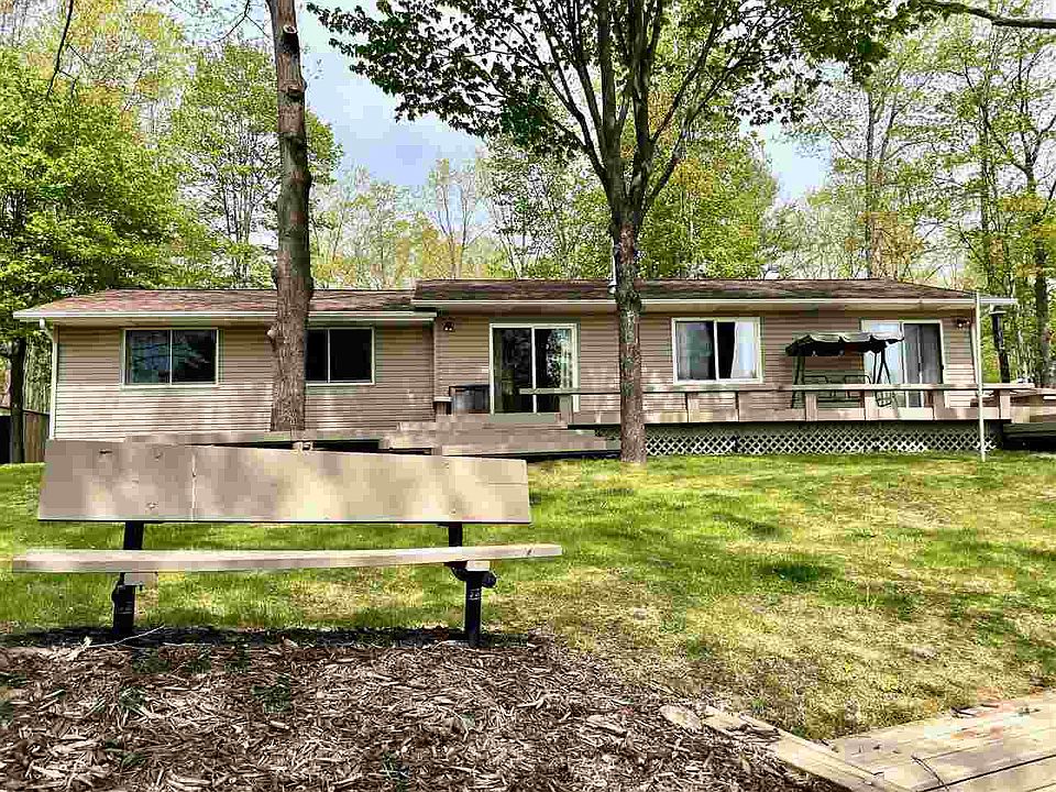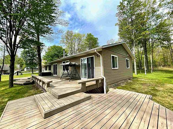 WOW!! RARE & BEAUTIFUL PENINSULA WATERFRONT LOT! This is for the people who want gorgeous views and room to roam. Three lots gives you 391 ft of main waterfront on all sports Secord Lake and 2 acres of land with shade trees and woods. This 2 bedroom 1.5 bath home has a large family room with wet bar, half bath, and plenty of windows facing the water. Great place to entertain or make it a waterfront master suite. Living room with dining L is open and bright with a cast iron wood stove for those chilly nights. Updated full bath, forced air furnace and A/C for comfort. Large waterfront deck for relaxing with canal frontage between the house and peninsula waterfront. Lot #3 is wooded with a 40x40 pole barn with electric, cement and 4 garage doors for drive thru access to easily pull your RV straight through. Additional 2 car garage where you can actually park your car in. This is the ultimate family compound with woods,water and land. Lowered water levels until dam upgrades are complete.