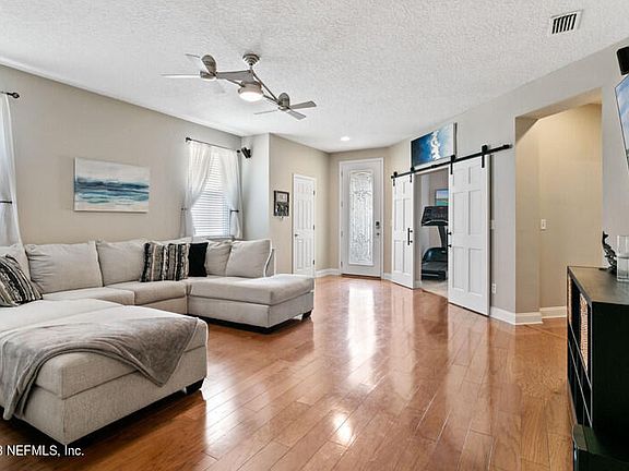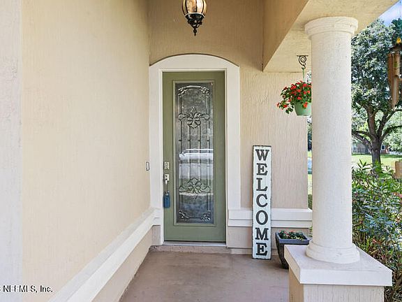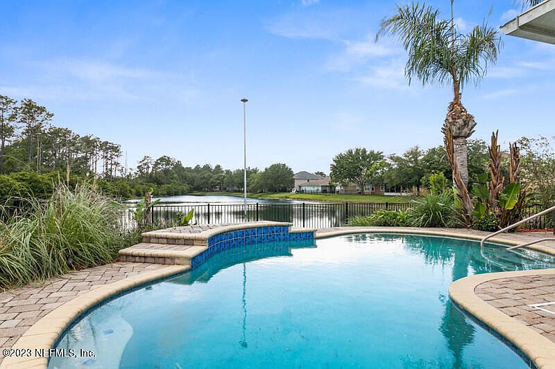 Hottest new beauty on the cul de sac in the community of Cedar Glen in Jacksonville, FL. A stunning 3 bedroom, 2 bathroom waterfront pool home with backyard oasis. Enjoy your outdoor kitchen overlooking salt water pool and gorgeous private water views. Larger than average bedrooms plus an office. Eat-in kitchen with an island and breakfast bar has an abundance of 42'' cabinets overlooking the den with wood-burning fireplace. Stainless appliances convey. 7 mounted TVs convey. Main living space w/ hardwood floors. Your new master suite has double-tray ceilings, a huge walk-in closet, raised vanities, jetted tub and separate shower. All-season patio with glass and screens lead to the outdoor kitchen with built-in ice chest, Lion Premium grill, and under counter lighting. Hurricane shutters, sprinkler system, water softener, solar screens on all windows. Solar panels - let JEA pay you! Bulkheaded! Pavered driveway. Full Stucco exterior. HVAC approx 7 years. Smart Vivent thermostat, doorbell and outdoor camera convey.