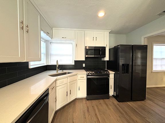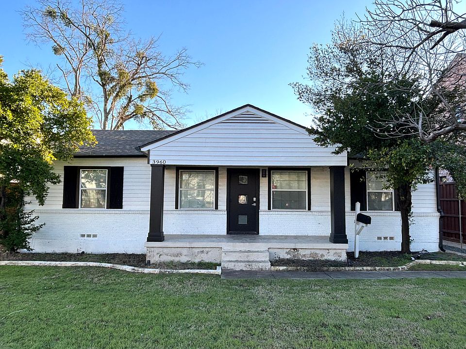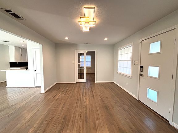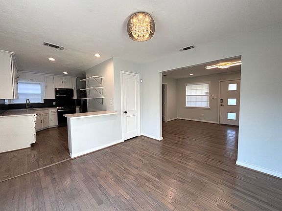 Surrounded by beautiful new construction homes, this charming Midway Hollow mid-century cottage features an expansive front porch for watching the world go by. Inside, you'll find a great open-concept living room, dining room, and kitchen. French doors in the living area lead to a versatile space that can serve as a study, home office, or third bedroom. The recently updated kitchen features white cabinets, stainless steel appliances, and stunning white quartz countertops complemented by a dramatic black tile backsplash. A breakfast bar opens to the dining room, perfect for casual meals or entertaining. The bathroom has also been tastefully updated, showcasing attractive quartz-style tile, a glass shower enclosure, and a modern vanity. Additional highlights of this home include refinished hardwood floors throughout, updated recessed lighting, contemporary window shades, replaced Low-E windows, and a soothing light paint color. French doors in the dining room open to a large wooden deck overlooking a huge fenced yard. Parking includes a long driveway leading to a one car carport and a one car garage. Available for move-in on February 1, 2025 (or possibly sooner if needed).