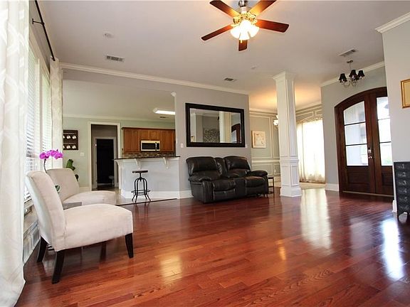 Experience rustic elegance in this split floor plan home featuring 4 BR, 2 bath, situated on quiet dead end lot in gated Bedico Trace Subd. The cool/neutral color scheme used throughout makes it perfect for relaxing in front of the beautiful custom fireplace built from reclaimed wood from an 18th century house. This home is all about details, starting with the custom paneling in the master bathroom, the beautiful wainscoting detail in the dining room and custom backsplash in the kitchen. Flood Zone (X)