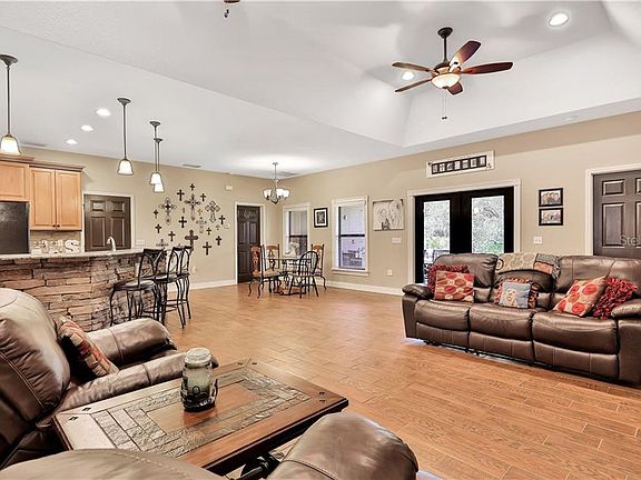 PEACEFUL PLACE WITHIN AN OAK HAMMOCK! Spacious custom home of 2,545 sq. ft. sits on 5 Acres and is just minutes to town, under 10 minutes! This property is fenced and gives room to roam with several paths through the woods to enjoy a nature walk or a fun spin on a trail bike. The attractive exterior of the house has stacked stone accents, a large parking pad at garage entrance and a covered back porch. Within this 4BD/3BTH residence is the desirable open concept, formal dining room, split bedrooms and an office. Beautiful enhancements include: Arched doorways, woodgrain plank tile floor thru-out, extra high tray ceilings, knock down spackling walls & ceilings, custom blinds, granite counter tops, stacked stone accent to kitchen island/breakfast bar, great lighting and plenty of ceiling fans! The master suite is large with tray ceiling and the stunning bathroom has large dual vanities, water closet, gorgeous tile shower stall and a relaxing spa tub. Two bedrooms, an oversized guest room and two additional bathrooms complete the home's interior, and take notice of the handsomely customized bathroom of a rustic theme! There is much to appreciate on the exterior, as there's a chicken coop for fresh eggs every morning, a fire pit, clearing for a barn with electric in place at the location and an outdoor kitchen has been roughed in. Call today to arrange a private viewing of this incredible property, the first step of making it your sanctuary to come home to!