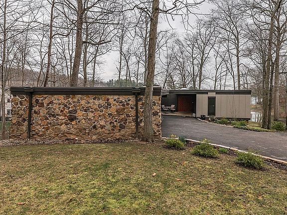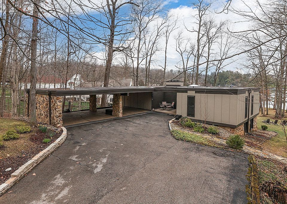 Lakefront, quad-level home, with stone and hardy board stucco siding, 3 car carport and flat roof in Foxcliff Estates N. One acre wooded lot with large hickory and oak trees, riprap stone shoreline, composite dock and sandy beach. First level consists of 3 bdrms and 2 full baths. Second level is open concept kitchen, dining and family room with fireplace. This level has stunning lake views from 3 (8 ft) sliders that step out on 2-level wood deck. The Third level consist of 1 bdrm, 1 full bath, full kitchen, laundry room and family room with fireplace. This level has a sliding patio door that opens onto a large composite deck. The fourth level is unfinished with the furnace, water heater, water softener, loads of storage and work bench. There is also a storage room under and side of carport.