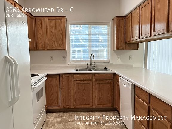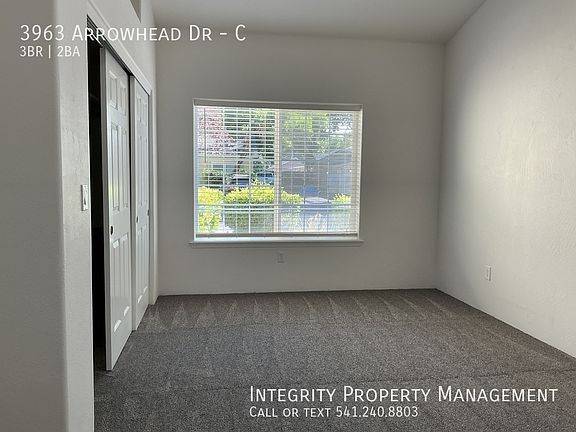 Bright & Spacious 3 Bed, 2 Bath Flat Welcome to your new home nestled in a well-kept, quaint, and inviting community in Medford. This exceptional lower-level 3-bedroom, 2-bath flat in a quadplex offers privacy, comfort, and contemporary style. Interior Highlights: Brand-new carpeting, attractive lighting, and a fresh, modern interior throughout A spacious master bedroom, set apart from the other two bedrooms for added privacy Large walk-in closet and a private en-suite bathroom in the master suite Open floor plan linking the living, dining, and kitchen areasperfect for everyday living and entertaining Washer and Dryer in unit Generous natural light and thoughtful layoutfeels bright, open, and welcoming Designated parking Property Features: 3 bedrooms, 2 full bathrooms Freshly updated and move-in ready Quiet and friendly quadplex community Private backyard patio with grassy area On-site parking and well-maintained common areas Conveniently located near schools, parks, shopping, and local amenities Located just minutes from downtown Medford, this flat combines easy access to city conveniences with a peaceful residential setting. Now availableschedule your showing today and discover your next home at 3663 Arrowhead Frequently Asked Questions: STATUS: Available Now PET RESTRICTIONS: No pets SMOKING: No smoking, no vaping, no marijuana INCOME REQUIREMENT: Gross 3 times monthly rent CREDIT REQUIREMENT: At least 600. MOVE-IN COSTS: First Month Pro-rated, Security Deposit $2300 DEPOSIT TO HOLD: $500 upon approval, holds up to 7 days. APPLICATION INSTRUCTIONS (HOW TO APPLY): Apply online. All complete applications are processed as they are received. First approved applicant to submit $500 deposit gets unit.HOUSING ASSISTANCE: Income must meet 3x the amount of tenant portion, plus utilities. More Information: Property Description Details AREA INFORMATION: Located in Northeast Medford off Crater Lake Ave FLOORING: Laminate/Carpet GARAGE/PARKING : 1 car garage plus exterior spot KITCHEN APPLIANCES INCLUDED: Fridge, oven/stove, dishwasher LAUNDRY APPLIANCES INCLUDED: Washer and Dryer included PROPERTY TYPE: Fourplex Unit, downstairs unit UTILITIES: Water, Sewer, Trash included. Tenant responsible for power and gas. YEAR BUILT: 1999 YARD: Rock and shrub, landscape maintenance included Application, Lease Terms, and Fees *ADDITIONAL FEES NOT INCLUDED IN RENT: APPLICATION FEE: $55 RENTER'S INSURANCE: Required unless exempt by ORS 90.222 APPLICATION TURNAROUND TIME: 2-3 business days LEASE DURATION: 12 months HOA Instructions None *All information is deemed reliable but not guaranteed and is subject to change.* All Integrity Property Management residents have the exciting opportunity to enroll in the Resident Benefits Package (RBP)! For just $39.95/month residents can enjoy exclusive benefits including HVAC Quarterly Filter Deliveries, comprehensive renter's insurance coverage, credit building to boost their credit score with timely rent payments, up to $1M in Identity Theft Protection, our top-notch resident rewards program, and much more! Residents can enhance their RBP by adding on-demand pest control for an additional $14/month.