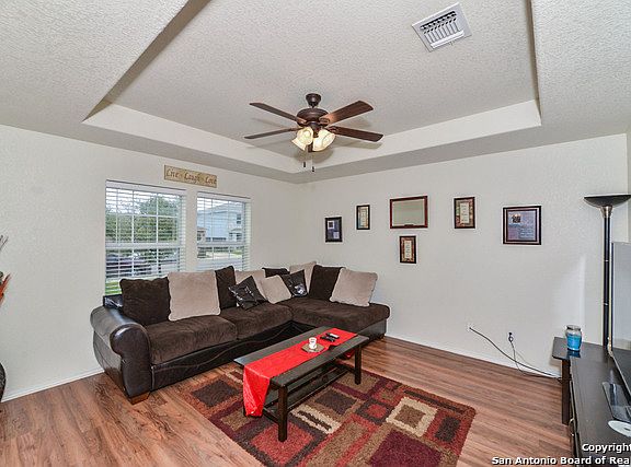 Charming & cozy one story family home offers open floor plan, separate dining room w/pass through to kitchen; Laminate flooring in living room, hallway & bedrooms; Ceramic tile in kitchen, dining room & baths; 2" plantation blinds throughout & ceiling fans in all bedrooms; Master bedroom has walk-in closet & tiled master bath; Large back yard w/plenty of room for kids and/or pets to run & play, privacy fence & no back neighbors; Subdivision has convenient access to I-10 & near Fort Sam & Randolph AFB.