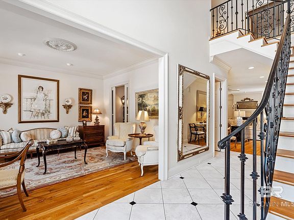 Welcome to Wimbledon Park, a beautifully maintained Spring Hill neighborhood where you can enjoy walking/playing in the tree-lined park. Easy access for shopping, dining and to the Country Club of Mobile. This Magnificent custom built home features 10 feet ceilings downstairs and 9 feet upstairs, custom moldings, 4 bedrooms and 3 full and 1 half baths. As you enter this 4,386 square foot stunning house you will notice the volume soaring ceiling height and the striking grand staircase. The home was built for entertaining family and friends. The elegant sizeable dining room seats 12, and features heirloom cornices and custom drapes. The expansive sunlit kitchen features stainless steel appliances, and a gas stove top with pot filler for the gourmet chef. It also features an oversized island with bar stools and a dining table for nighttime dining, and tons of storage and a walk-in pantry. The elegant Master bedroom features custom drapes, his and hers walk-in closets, a walk-in shower, a jacuzzi tub, an exceptional sized dressing area and one area dedicated especially for her. Additional features are an upstairs bonus room, beautiful hardwood floors, wet bar, gas log fireplace in den, sizeable courtyard for outdoor entertaining, whole house generator and roof in 2024. For Mobile Country Club members, there is a private gated access for your personal golf cart to enjoy all the amenities the country club has to offer. Call to make your private showing today. Real Estate Agent is related to Seller. Buyer responsible for verifying all measurements and relevant details. Buyer to verify all information during due diligence.