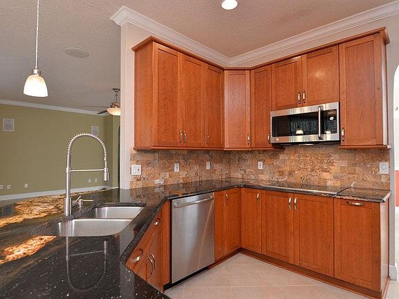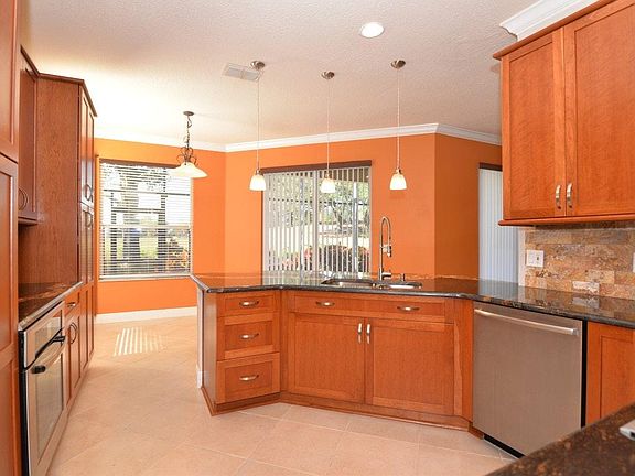 This Home is loaded with UPGRADES. If a Gourmet Kitchen is what you want look no further! This kitchen is complete with GRANITE counter tops, solid wood custom cabinets with 42" uppers, 48" SUB ZERO refrigerator, BOSCH STAINLESS steel 800 series oven, induction cooktop and dishwasher, Monogram speed cook oven/microwave above cooktop, natural stone backsplash, LED lighting above and below cabinets and pendant lighting. The Living/Great room is complete with ceramic tile flooring on diagonal, surround sound built in to ceiling and walls and upgraded fans. The master bedroom has 2 closets and the MASTER bath has marble counter tops, dual sinks, amazing free standing tub, and a walk in shower. ALL this with 5 1/4 " baseboards and CROWN molding throughout. Separate Dining with chair rail. Split floor plan. Enjoy the most amazing SUNSETS on your extended 15x35 screened in Lanai. Need room for a GOLF cart or work area this home has it all including attic storage w/ built in ladder. The community includes 24hr staffed gated entry, pool, hot tub, workout facility, Clubhouse, tennis courts, cable, internet and phone. View the SPACE Shuttle launches from the backyard. NO SMOKING. Owner pays for phone, basic cable, and internet. Renter pays all other utilities. NO PETS. NO SMOKING.