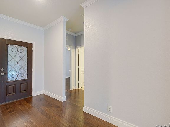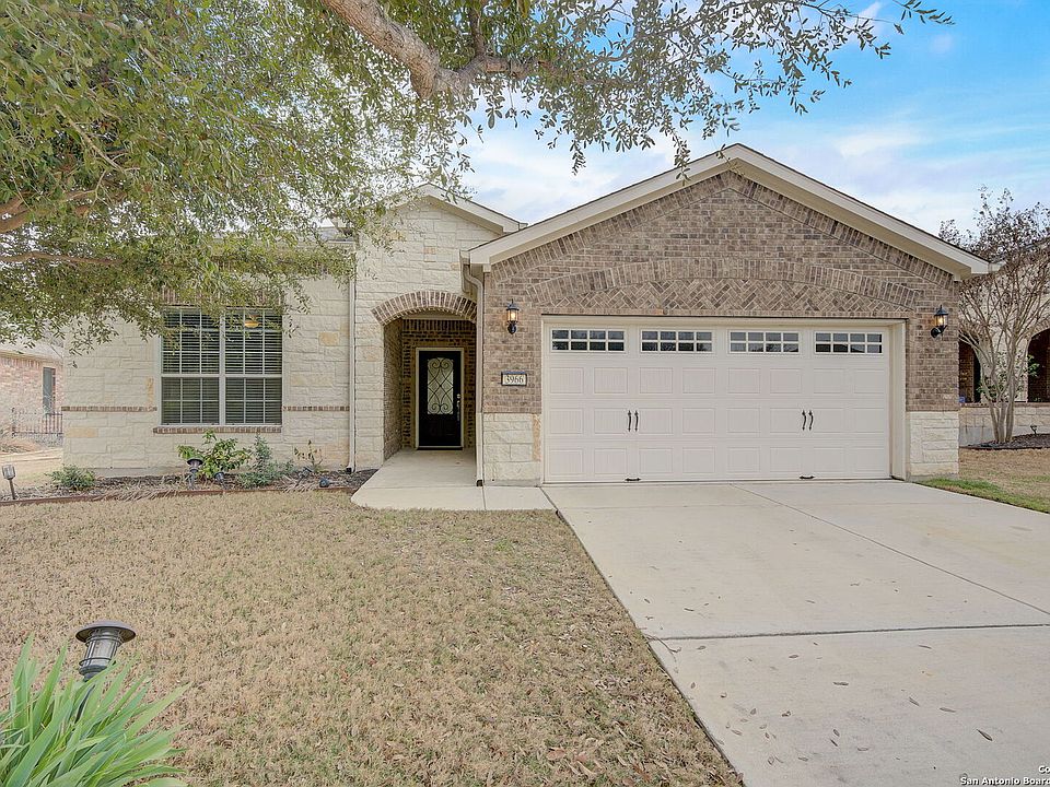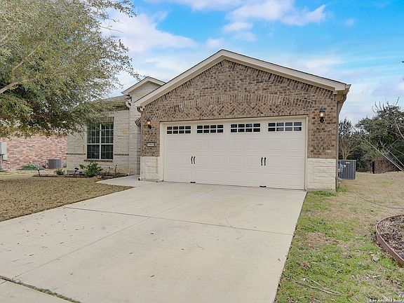 This pristine 1-story home in the over-55 community of Hill Country retreat is move-in ready, and backs to a greenbelt! Featuring an open floor plan with hardwood flooring, crown molding, a spacious living room and open kitchen with breakfast bar, granite counters, stainless steel appliances including a gas range and dining nook with backyard access, home office/flex space, inside laundry room, primary bedroom with backyard views and bath with an extra-large walk-in shower and separate vanities. Enjoy the serene treetop and big sky views from the extended back patio, ready for entertaining or relaxing. The home is conveniently located nearby schools, parks and community amenities, and provides easy access to 1604, shopping and more. Don't miss this opportunity to make this your next home, book your personal tour today!