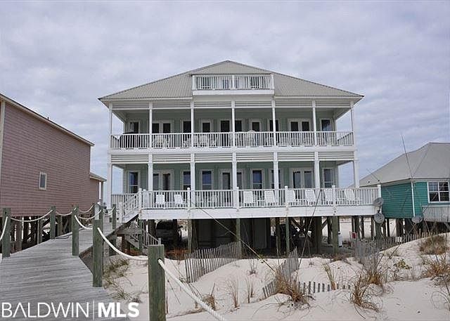 Gulf front with boardwalk to 75 feet of your own private beach. Beautifully maintained owner- occupied since built with rentals limited to 10-12 weeks per year. Elevator. Tung oiled pinefloors throughout with tile in bath rooms (no carpet). Last house on dead end no outlet street. Concrete level 16’ x 16’ shed contains utility refrigerator. Covered parking for 4. Additional parking for 4 in driveway. First level Two Gulf front master suites with king beds, each with private bath with twin sinks and multi head showers. One queen suite with private bath. Bunk room with 2 bunkbeds and private bath. Family room contains 9’ regulation Brunswick pool table, 55” HDTV with sound bar, DVR, and Blu Ray. Kitchenette with dish washer, microwave, refrigerator, under counter ice maker. Laundry room with front load HE washer and dryer. 52’ x 22’ porch with chase lounges, tables and chairs. Second level Gulf front master suite with king bed, private bath with twin sinks, Jacuzzi, and multi head shower. Front load HE washer and dryer. Great room features gas fireplace, 55” HDTV with sound bar, Blu Ray, and DVR. Dining area includes seating for 12, counter seating for . Gourmet kitchen features 5 burner gas cook top, double oven (one convection), two dish washers, and French door refrigerator. On this level is a 52 x 12 dining deck with sit down dining for 17, rocking chairs, and propane grill. Third level Study/office, playroom, and sleeping for 5. Fantastic views of Gulf and bay from decks on both north and south sides.