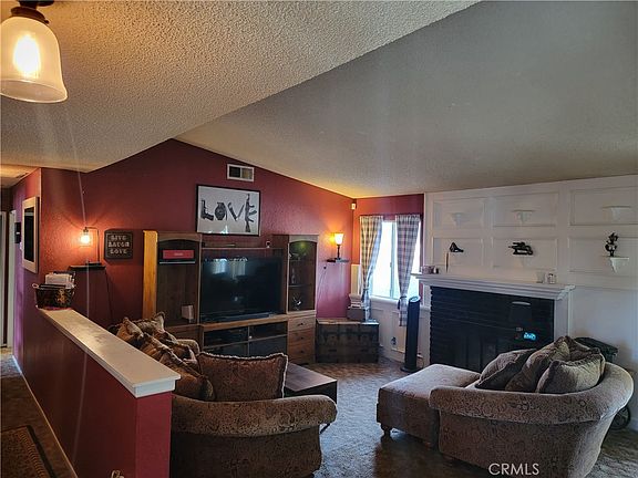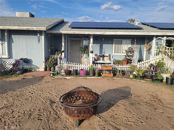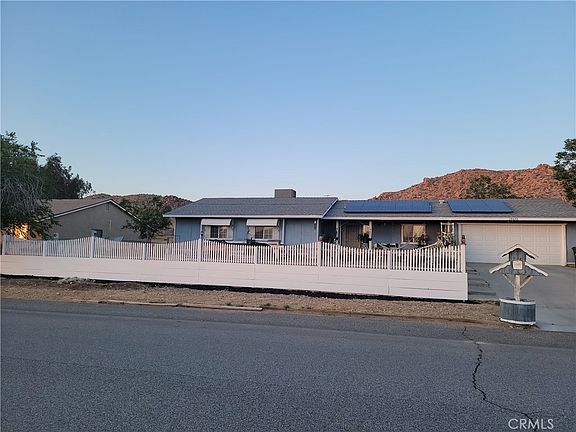 This colorful ranch-style home, located near Stephen Sorensen Park is complete with white picket fencing and a popular floor plan. With a front view spanning across the charming, unincorporated, desert town of Lake Los Angeles and backed by beautiful buttes that are perfect for hiking, the sunsets are amazing and, with almost no light pollution, the night skies are filled with a blanket of stars. The open floor plan features many upgraded amenities including floor tiling, light fixtures, backsplashes, ceiling fans, bi-folding cupboard doors, and a beautiful bespoke mantelpiece with added wall shelving over the living room fireplace. The kitchen includes plenty of counter space and cupboards, an oven/stovetop plus a fairly new microwave with a venting fan, dishwasher, kitchen sink, upgraded flooring, and backsplash next to a recessed dining area. The master bedroom has a sliding door that goes out onto