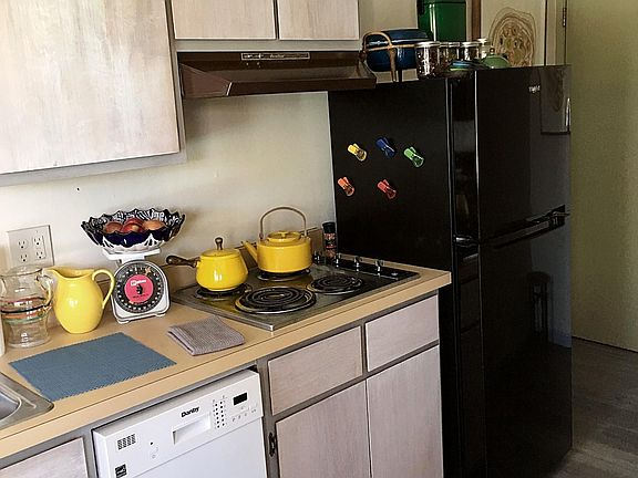 For rent is a lovely mid-century modern fully detached guesthouse casita in Central Tucson that has been remodeled and restored. All utilities are included so there is only one payment per month. This is a junior one bedroom studio house with a separate kitchen and bathroom. The design is eco-friendly with lots of recycled and vintage furnishings, a high end queen mattress bed, recycled area rugs, etc. Minutes to downtown or the University with the 3rd St corridor. Right by Speedway off Pima. Walk a couple blocks to the Botanical Gardens on our tree lined street with nice sidewalks. There is a full fridge in the kitchen with a new dishwasher and faucet, plus a vintage stove-top and Oster convection oven. There is a full shower plus sink in the bathroom and new laminate flooring in the kitchen area. The bedroom is finished concrete for a cool industrial look. Included is access anytime to the amazing round pool, backyard and patio. Utilities provided are electric, gas, water, central heat and air, garbage/recycling, high speed unlimited wifi that works throughout the property (mesh system), a separate laundry room, and the pool. There is tons of closet space. The queen bed has separate mattress firmness settings per side via remote. There is a remote and light for the ceiling fan. Also included is a fantastic bluetooth stereo/alarm/charging station with remote. There is easy street parking and the property is fully fenced with 6' high concrete and is very safe. There is potential for gardening. The home is less than a mile to great restaurants, coffee shops, The Loft theater and major shopping. Trader Joes, Whole Foods and Sprouts are easily in biking distance. There is keyless entry into your home with a code. You'll be near the bike path to get to the University area quickly. The rental house space is 590 sq ft total. The bedroom is separate from the kitchen and bathroom. There is not a living room, just the large bedroom with shelving and closet. The house is furnished with a full sized futon bed/sofa along with the queen. No pets or cigarette smoking please. No exceptions. This is best for one person. I live in the main house. $1000/mo including all utilities, pool, garbage, fast wifi, parking, etc. I prefer a 6 or 12 month lease but will be flexible for the right person. Furnishings can be removed as well. Available immediately or as late as January 1st. All utilities included including pool, laundry, and wifi