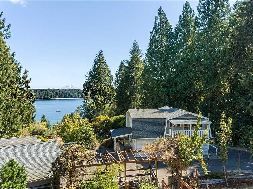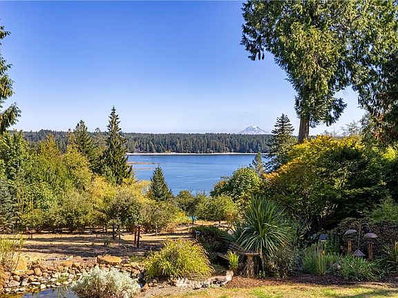 Stunning views! Acreage! This well kept home features breathtaking Mt. Rainier, Pickering Passage and Harstine Bridge views! Over 6 acres (5 parcels) of private oasis boasts garden space with grapes, orchards, chestnut trees, a pond and more. Featuring a large deck with plenty of space for entertaining with a gorgeous view! A detached outbuilding that features carpet and electric fireplace adds potential for extended living space or guest quarters. Plenty of covered storage space for lawn mowers and other yard equipment. Newer roof and ductless heating and cooling. Excellent location for nearby recreation; fishing, boating, hiking. This home is a spectacular slice of the Pacific Northwest, waiting for you!