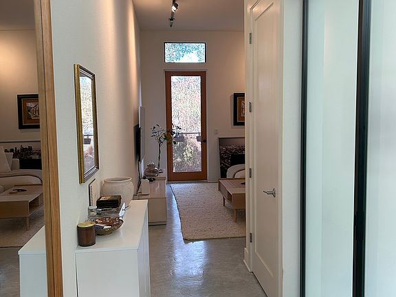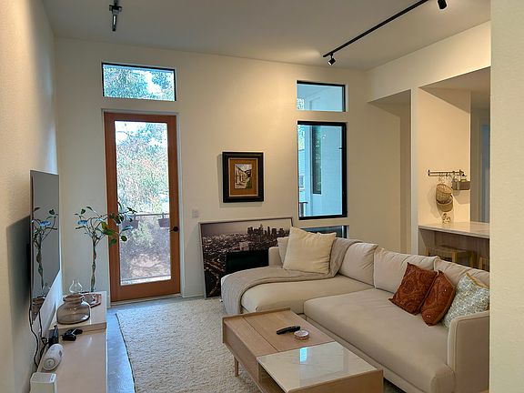 Designed and built by a local architect, this urban infill project is located in Mission Hills and is nestled at the edge of a small canyon with Eucalyptus trees. The unit is a modern 784 square-foot two-bedroom offering soaring 10.5 foot ceilings, an abundance of natural light and canyon breezes, dual patios, chef's kitchen with large sit-in island, quartz countertops, gas range, central heating and air, full size in-unit washer and dryer, daylit bathroom, large soaking tub, and one covered parking spot INCLUDED. With a walk score of 94, shops and restaurants like La Puerta, Lefty's Pizza, M Theory Music, Heartwork Coffee, Starbucks, Vons and Lazy Acres are a short stroll away. This sophisticated one of a kind unit is unlike anything else on the market. Cats and dogs welcome with certain breed restrictions. $500 refundable pet deposit and $50/mo. pet rent.